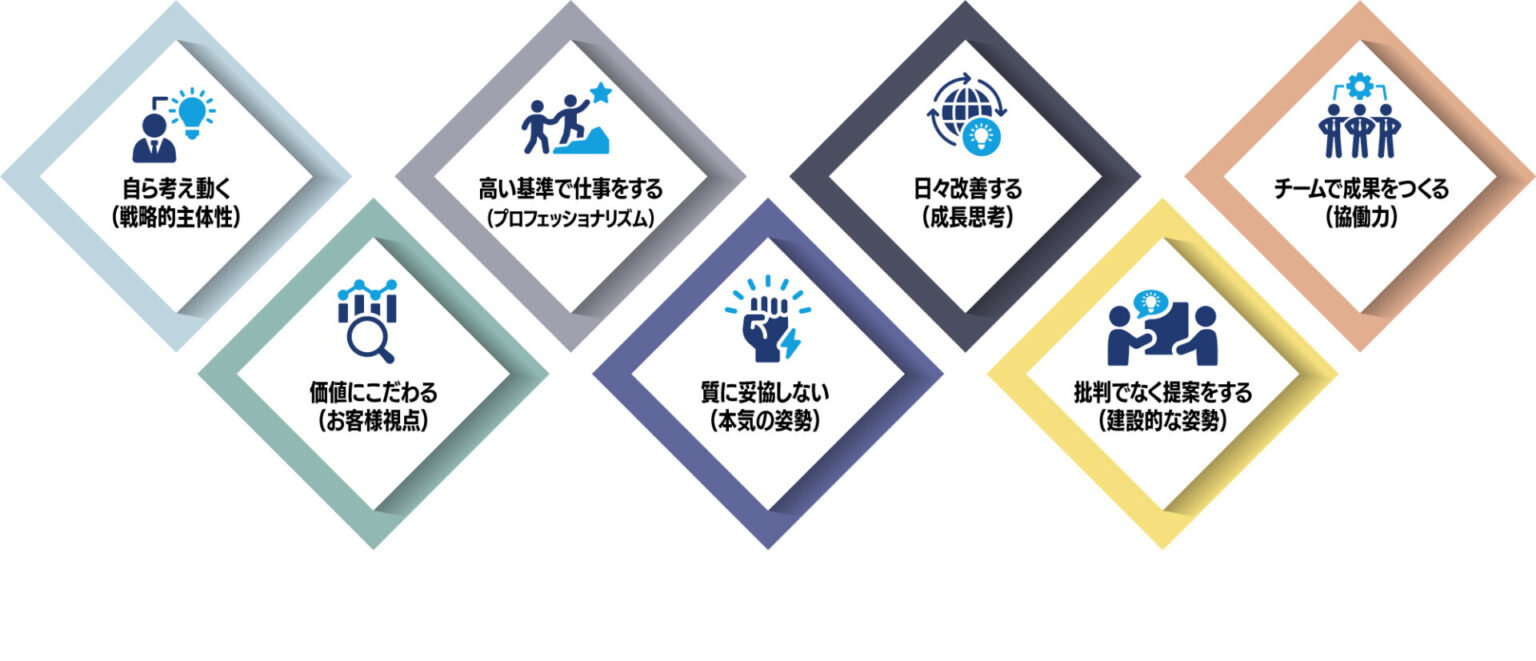 働きやすい環境とは、甘い環境のことではありません。互いに尊重し合いながらも、高い基準で仕事をするからこそ、成長とやりがいが生まれます。クリエイトバリューでは、以下の7つを理想の行動習慣としています。